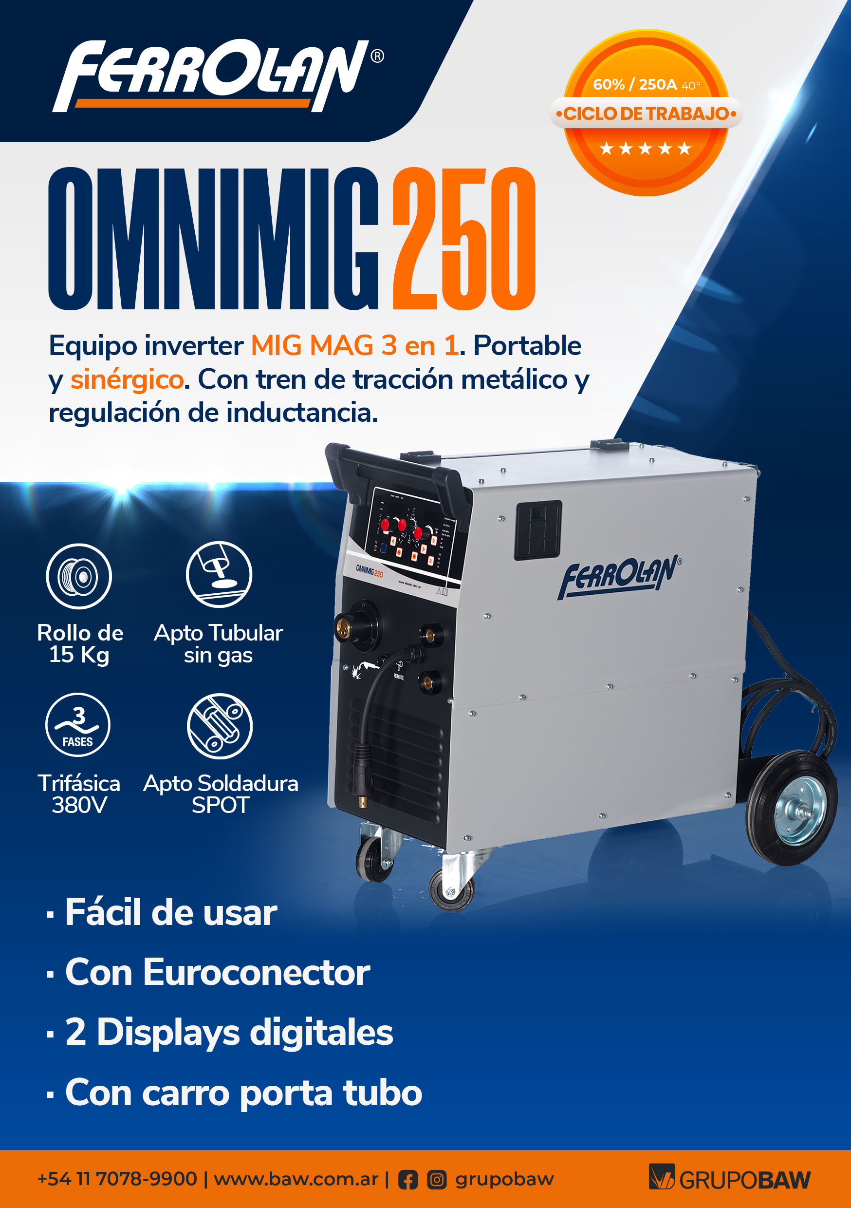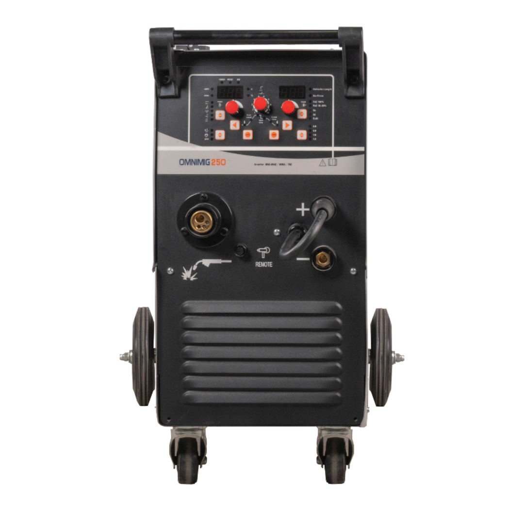 La Soldadora OMNIMIG 250 es un equipo de tan solo 54 KG con un sistema SINÉRGICO de 250A 3 en 1, multriproceso, diseñado para soldar en proceso MIG/TIG LIFT/MMA.
