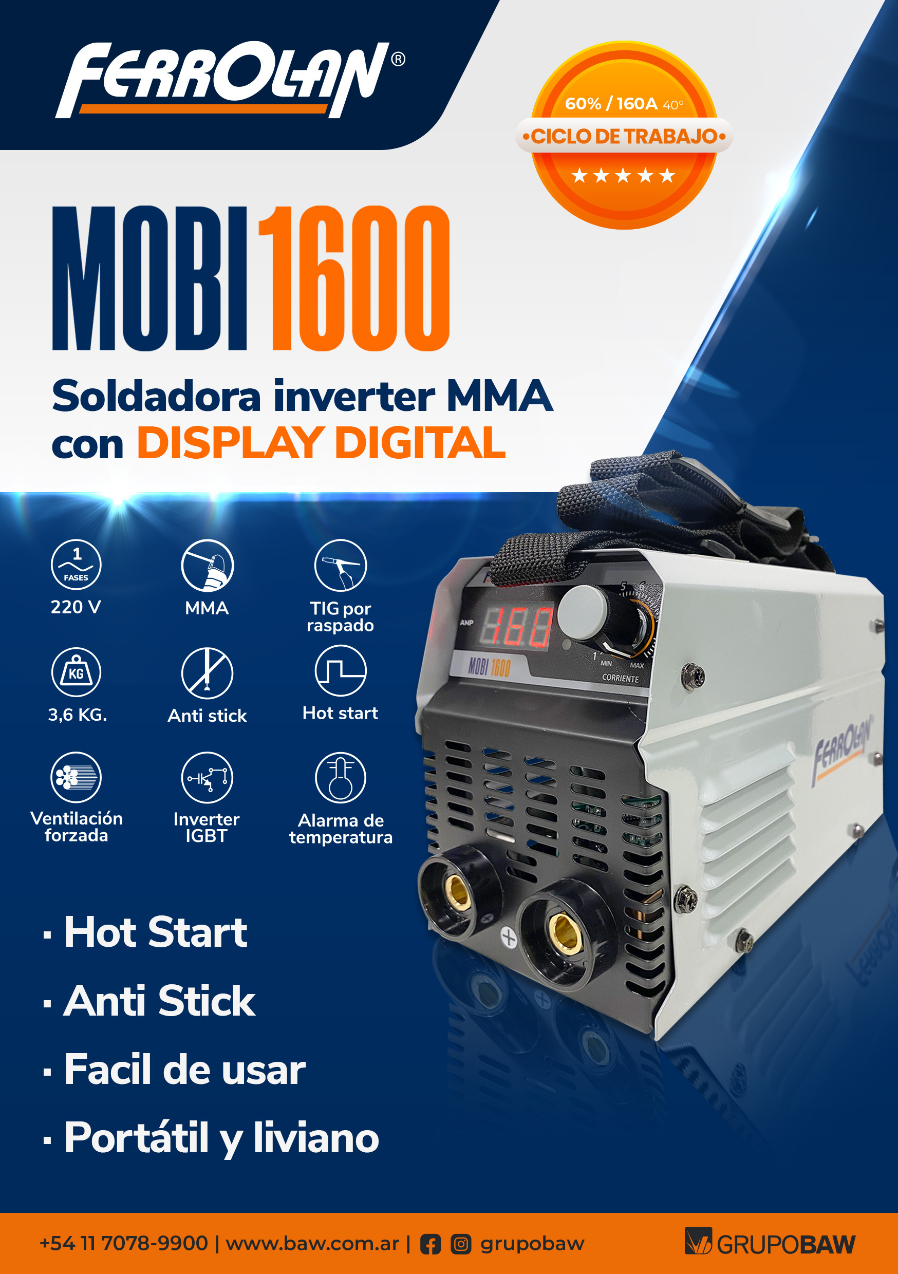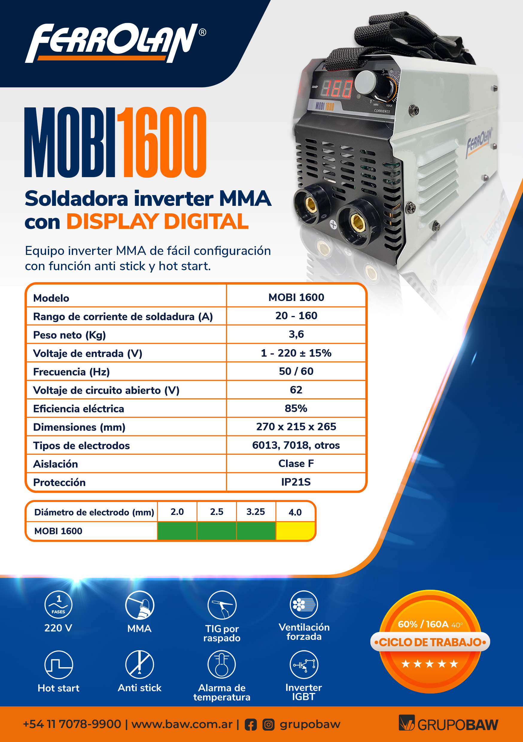 Con alimentación 220V, ultra liviano, equipo MMA con tecnologica IGBT, inverter, de 160A recomendado hasta electrodos revestidos de 3,25mm.